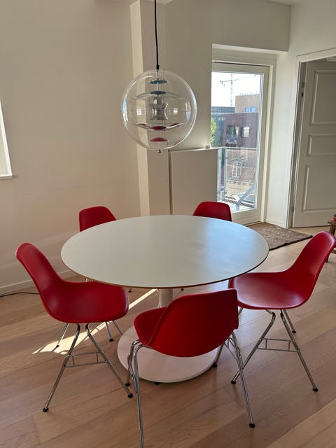 Jeg tror, det er vores 4 DSS side-chairs fra Eames. De er købt brugt på DBA til 1.000 kroner stykket. De er i glasfiber og i en farve, der ikke bliver produceret længere, men en ny DSS side-chair koster imellem 1.600-1.900 kroner stykket. Og så er de i plastik.