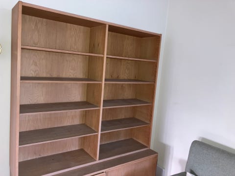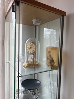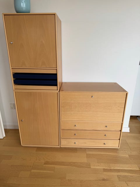 Jeg fjernede alle hylder i det midterste rum. Efter mit maleri på bagvæggen var færdigt, købte jeg en rundstok i BAUHAUS med de to holdere til. Jeg var faktisk LIGE ved at forelske mig i et messing-sæt, men tænkte det alligevel ville blive for meget med alt det, der ellers forgår i dette skab! Så det blev en fin lys træstang med "sølv" holdere