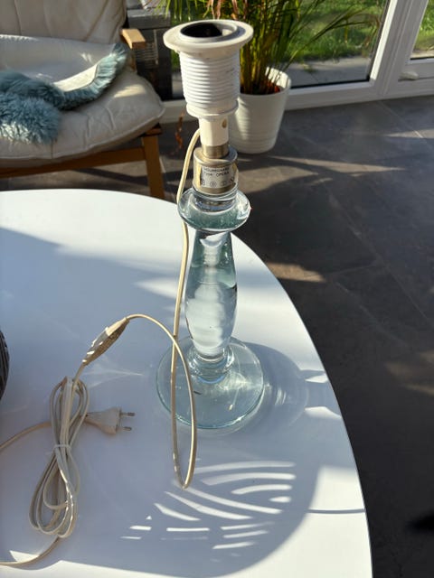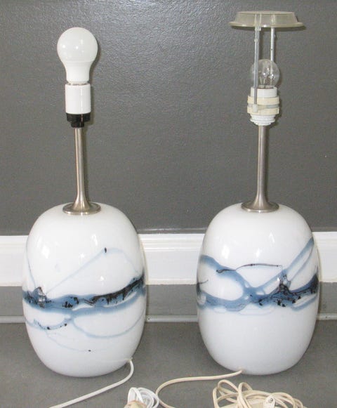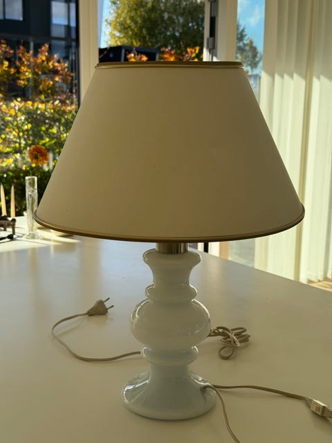Jeg har arvet en smuk mundblæst glaslampe fra Holmegaard, som mine forældre fik i bryllupsgave. Lampefoden har de helt rigtige 70ér referencer, som hitter stort netop nu og den lilla glassur i glasset matcher samtidig fint et stort maleri, vi har hængende. Men skærmen var slidt. Den var gulnet af mange år på et loft, skæv og gennemgående trist. Så jeg fandt en løs lampeskærm med samme diameter og et mere nutidigt look – samt en ny ledning og fik dette sat på. Udtrykket blev et helt andet og mere opdateret look. Og den er både min nu, fordi den matcher mig. Men rummer fortsat en masse nostalgi og minder.