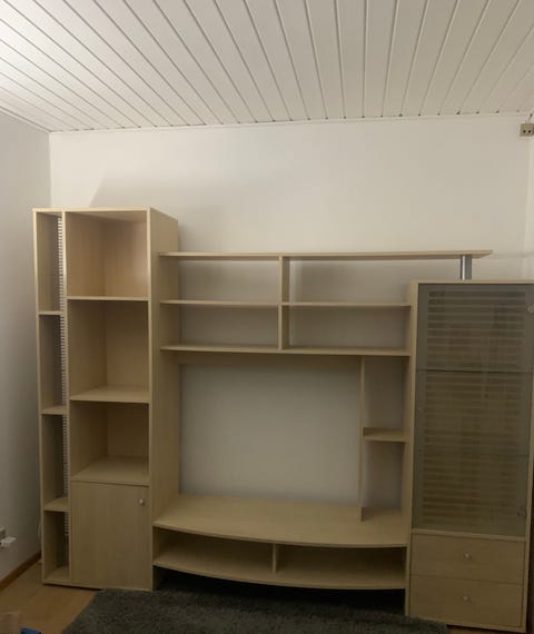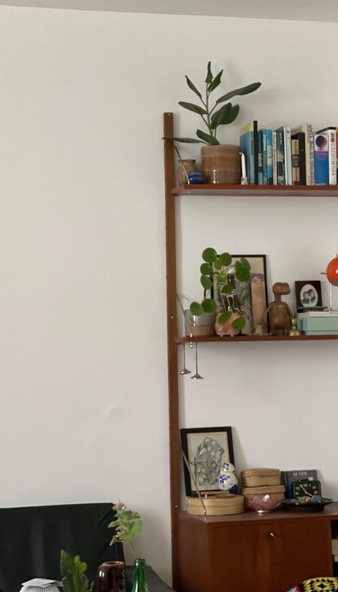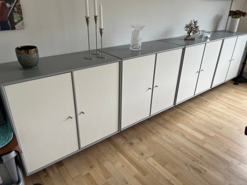Jeg fjernede alle hylder i det midterste rum. Efter mit maleri på bagvæggen var færdigt, købte jeg en rundstok i BAUHAUS med de to holdere til. Jeg var faktisk LIGE ved at forelske mig i et messing-sæt, men tænkte det alligevel ville blive for meget med alt det, der ellers forgår i dette skab! Så det blev en fin lys træstang med "sølv" holdere