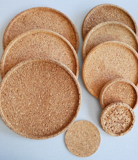 Du kan enten gå i gemmerne og finde diverse bordskånere eller prøve på DBA og se, hvad der er af kork-effekter til salg. Du kan jo være kreativ, for vægpynten behøver ikke nødvendigvis at se ud som den, jeg har lavet. Den kan også laves med andre former. Og har du lyst til farver, så kan du også vælge at male nogle af dem helt eller delvist.