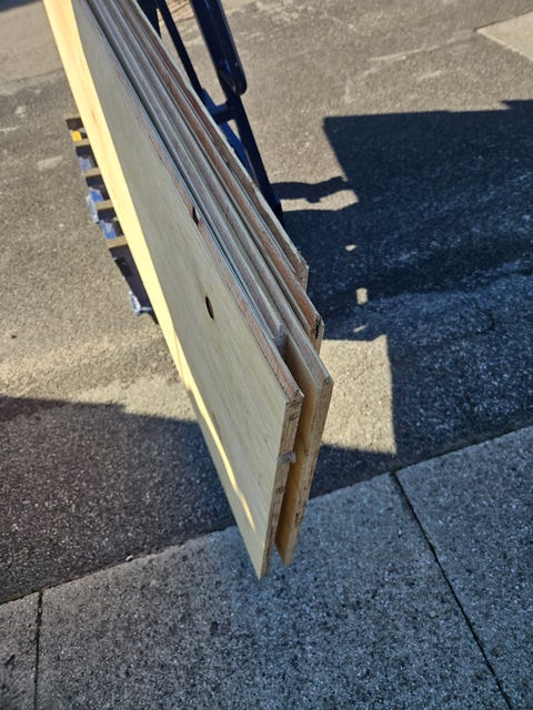 6. Det nederste stykke skal nu skrues på. Placer de små stykker krydsfiner imellem pallen og den plade krydsfiner for at skabe afstand.