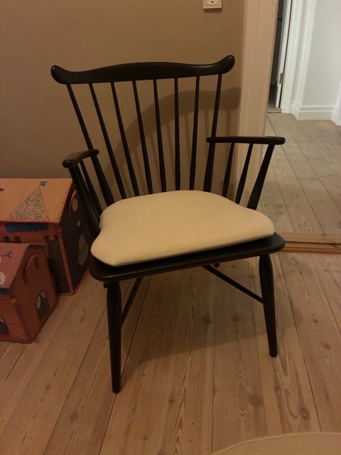 Denne stol forelskede jeg mig straks i da jeg så den første gang hjemme hos Louise J's skønne, skønne hjem! Den er lavet for FDB og er helt unik i formerne synes jeg! Jeg er vild med den ret mørke træsort. Stolene er, som så meget andet godt fra den tid, blevet reproduceret - så derfor fik jeg også helt mundvand da jeg ENDELIG spottede en DBA annonce med hele 3 af slagsen! Jeg fik lov til at erhverve mig den ene - og jeg var så lykkelig!
