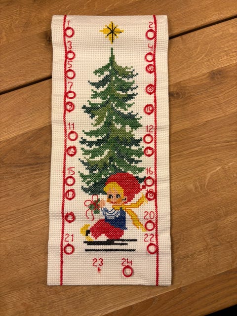 RETRO JULEBRODERIER Herefter kan du måske kigge lidt efter nogle fine julebroderier**.** Ja, så bliver det alt så ikke mere mormor! Ikke desto mindre så er det mega hyggeligt! Som barn havde jeg en broderet pakkekalender. Så fin og direkte indbegrebet af jul for mig. Vores børn skal helt sikkert have sådan en hængende på døren!