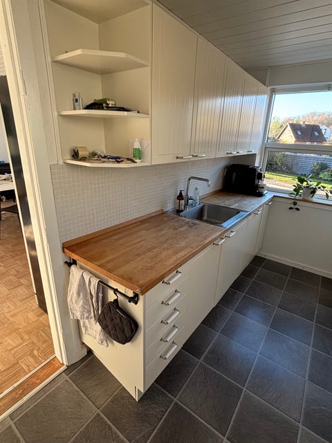 Maria Regina og hendes mand valgte at købe et nyt køkken til deres 70’er-villa, men du kan også snildt købe dem brugt og eventuelt upcycle dem. I skrivende stund er der på DBA over 12.000 køkken-annoncer. Find de billigste køkkener her.