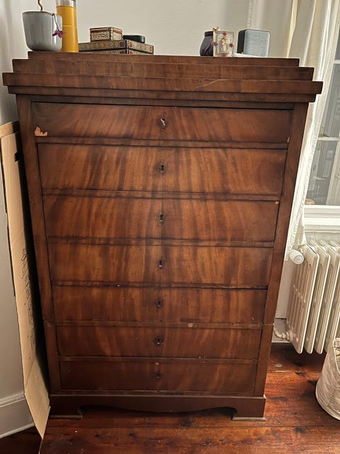 Kæresten er meget glad for den 2 meter brede, gamle købmandskommode, som Chili fik for 100 kroner og efterfølgende selv har slebet og givet en gang maling. Søger man på den slags kommoder fra ny er prisen gerne en hel del højere – op til flere tusinde kroner – og så er både Chili og kæresten enige om, at kommoden her hører under den slags ting, der slet ikke er fede at købe nye: