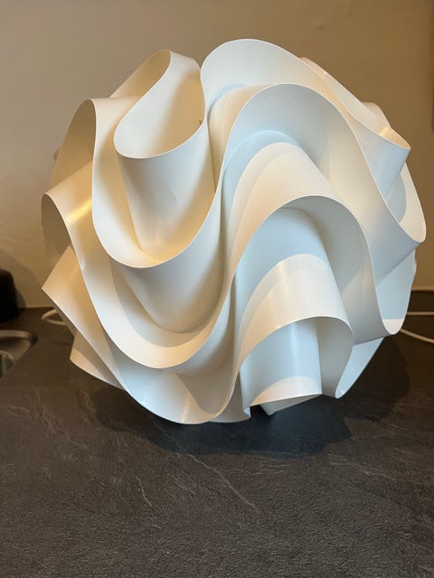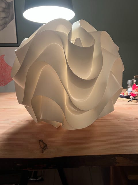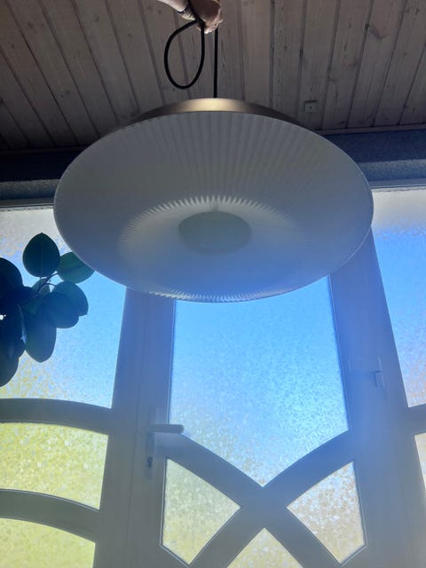 Den søde dame, som jeg kom ud til, inviterede mig indenfor, hvor vi fik en lille snak om lampens historie. Den havde hængt i et sommerhus i over 20 år, og nu var det tid til udskiftning. Da jeg nævnte, at jeg nu måtte på udkig efter en Le Klint lampeskærm, sagde hun, at det var sådan en, der originalt havde været på, og at hun rent faktisk havde den stående ude i garagen