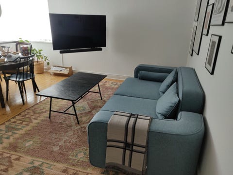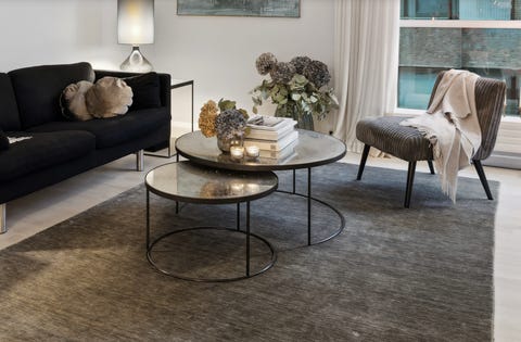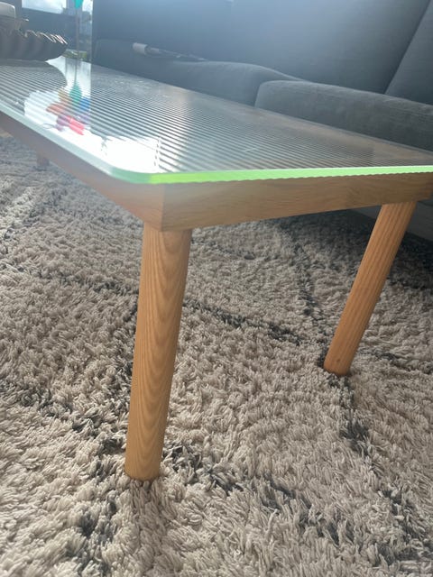 - Sofabordet med glasplade fandt jeg til 500 kroner på DBA. Jeg synes, det har en virkelig fed kombination af noget gammelt og noget nyt. Lige nu holder jeg dog også øje med marmorplader på DBA, for jeg tror måske, jeg bliver træt af glaspladen på et tidspunkt.
