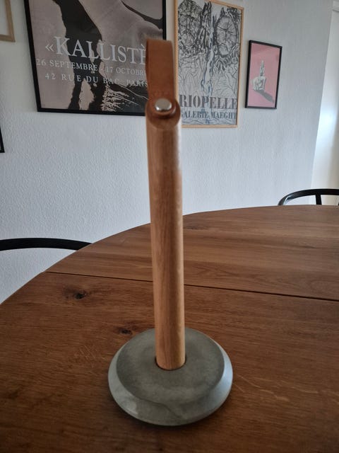 Min høvlebænk har vi forvandlet til et bord, fordi vi har sat en bordplade i passende længde ud fra den ene side. Jeg har også købt en kiosk-bladholder, som jeg i dag bruger til at have toiletpapir i.