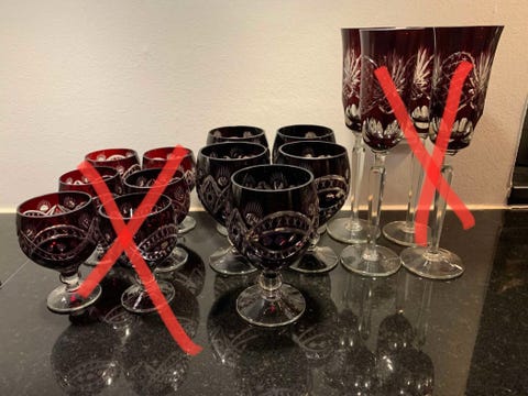 Glas: I denne opdækning betyder glassene utroligt meget - det er her, du skal sætte alle kræfter ind! Vi har valgt en super cool kombination af gamle, farvede glas, som virkelig giver en flot effekt. Kombiner gerne to nuancer - hvis muligt - og gå efter forskellige looks og typer. Der er ingen regler, så miks på kryds og tværs. Især de bøhmiske glas er elegante og kan fås mange steder brugt på DBA og loppemarkeder landet over. De er dyre - omkring 100-200 kroner stykket -, men kan også sælges for samme pris igen – og måske endda højere, hvis du sælgere flere samlet.