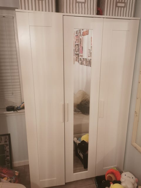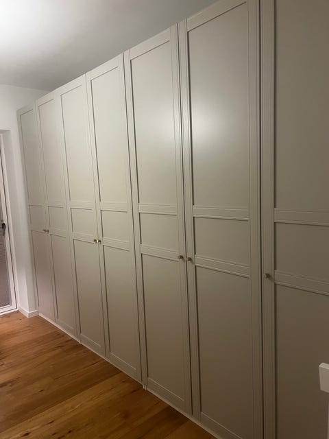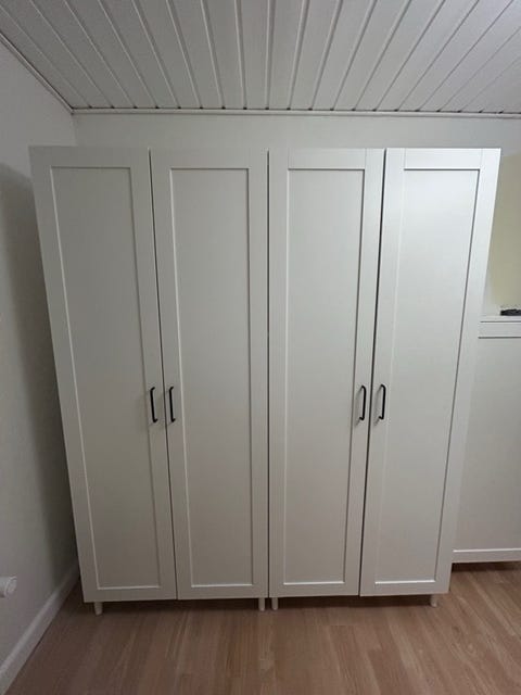 Tag de nederste hylder ud, så du har plads til dine ben, sæt en hylde i passende højde til bordplade – og sørg så for, at der er nok plads til, at din computer kan være der. Så kan du bruge resten af hylderne til tøj, og hvad du ellers har i skabene. Du kan også bruge hylderne til til din printer, mapper og bøger, så de ikke ligger fremme.