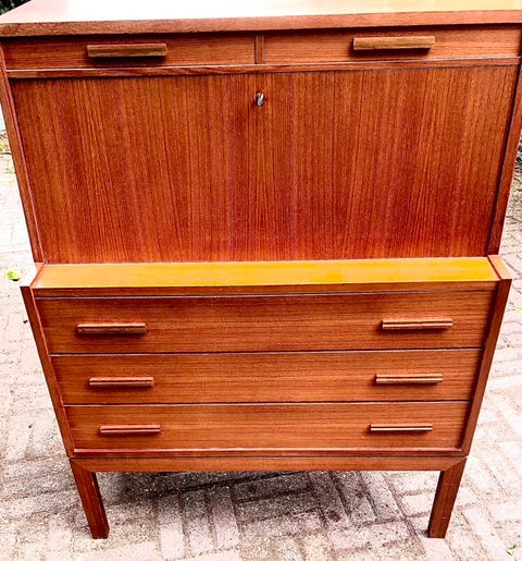 Du finder mange fine borde under søgeordet "retro skrivebord" eller "teak chatol"