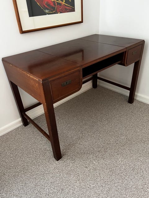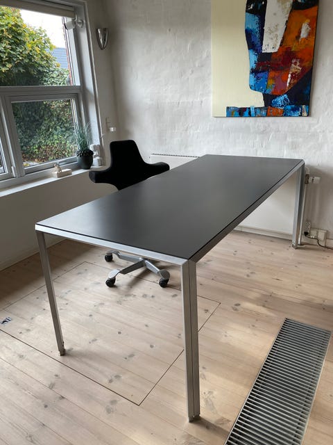 Faktisk er mit nuværende skrivebord helt fantastisk! Jeg arbejder som selvstændig på alle mærkelige tidspunkter af døgnet - og det er derfor rigtig rart fx. at kunne trække det hen foran fjernsynet om aftenen. Mit skrivebord er med teakbordplade og metalstel i en herlig petroleumsgrøn. Smadret på den helt rigtige måde.