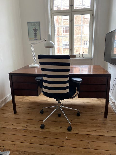 Årsagen til at jeg leder efter en nu, selvom jeg allerede ejer en gammel Wegner-sag, er at fjedrene desværre er ret gamle. Man kan tydeligt mærke dem når man sidder i den. Så den er ikke rar at sove i, men fungerer ganske glimrende som sofa, når vi om aftenen sidder og læser i den ene bog efter den anden inden Alfred skal i seng. Så jeg leder!