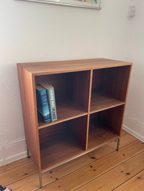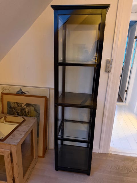 Jeg fjernede alle hylder i det midterste rum. Efter mit maleri på bagvæggen var færdigt, købte jeg en rundstok i BAUHAUS med de to holdere til. Jeg var faktisk LIGE ved at forelske mig i et messing-sæt, men tænkte det alligevel ville blive for meget med alt det, der ellers forgår i dette skab! Så det blev en fin lys træstang med "sølv" holdere