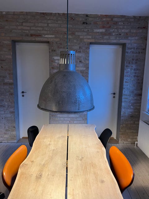 Tillykke, med din egen, lækre industrilampe, som vil være super dekorativ over et spisebord.