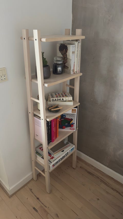 Der er de skønneste runde former ved loftet med masser af opbevaring og plads til nips. Under det gamle tæppe gemmer der sig et fint blåt gulv.