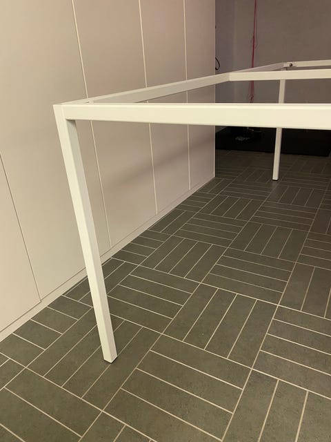 TIP.: Du kan selvfølgelig også bruge en rå træplade, en spånplade du har slebet og malet med højglans-maling – eller noget helt tredje, som bordplade. Så skal du blot huske at bordpladen skal monteres på stellet, for at den bliver hvor den skal. På samme måde kan du få et bord i den størrelse og højde, du vil have, baseret på det stel du finder.