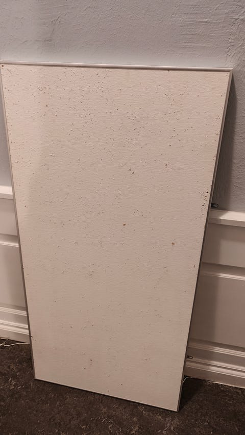 Vi fandt en brugt opslagstavle på DBA til 50 kroner. Det viste sig at være en akustik plade fra en børnehave, men faktisk er har det kun sin fordel at bruge sådan en plade som opslagstavle. Især når man, som os, har et stort køkken-alrum med dårlig akustik. Pladen hjælper os med at skabe god akustik, og samtidig har vi fået en smart opslagstavle.