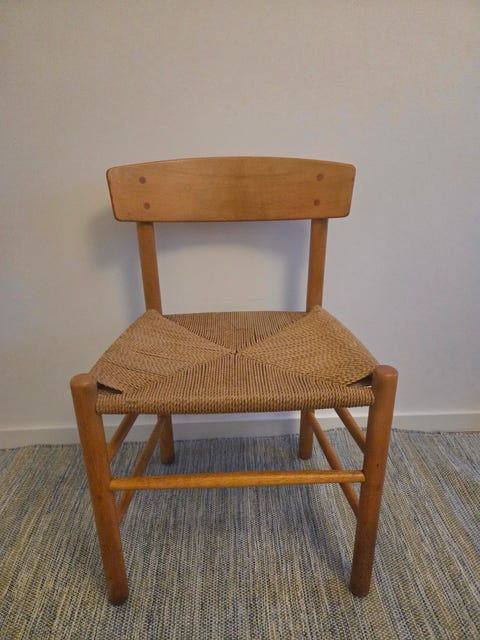 ’Folkestol’, hvis sæde er flettet i papirgarn, produceres af Fredericia Furniture og sælges for 3.500 kroner. På DBA kan du finde stolen til 1.400 kroner og dermed spare mere end 2.000 kroner på at købe den brugt.