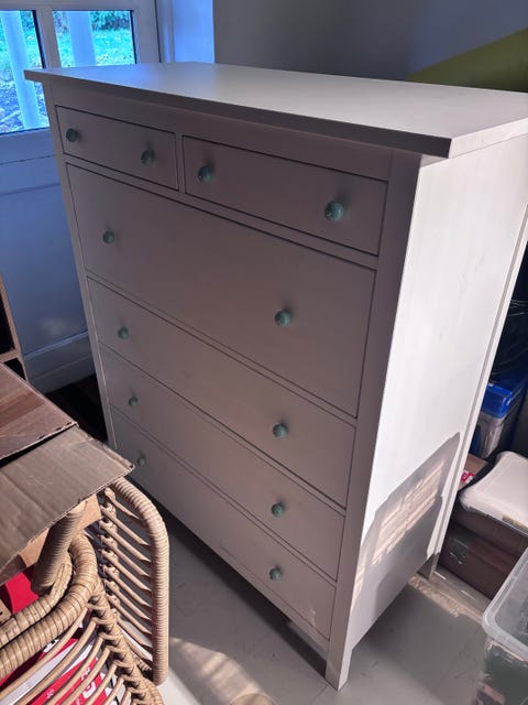 Et andet trick er at tilføre en ny farve. Her har man malet hver kommodeskuffe i forskellige lyse pasteller. Hvis du vil lave noget lignende i dit hjem, skal du sørge for at vælge farver med samme glans eller mathed. I dette tilfælde fungerer den matte finish godt til at skabe et roligt udtryk.