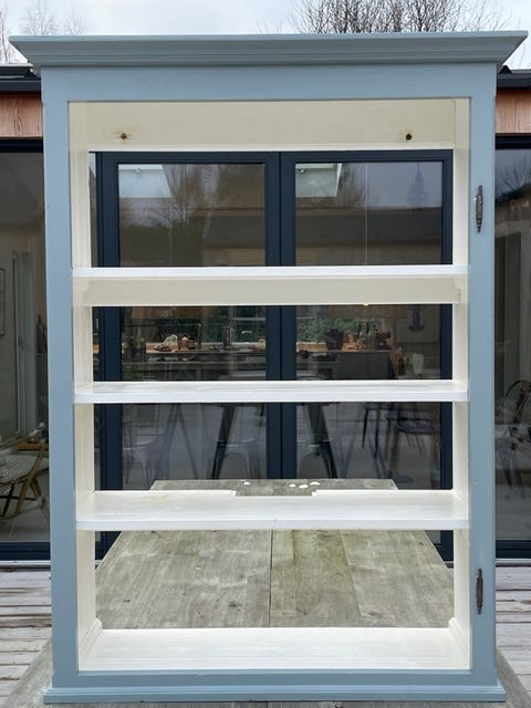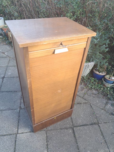 Pernille kan godt lide, at møblerne er lidt skæve i udtrykket. Hun har eksempelvis købt dette postskab, som har stået ved Give Posthus. Hun købte fem forskellige postskabe/pakkebokse for i alt 2.000 kroner. Det skab du ser på billedet, solgte hun for 1.000 kroner. Hun har et magen til, som hun har beholdt til sig selv. Hun har også solgt en pakkeboks for 900 kroner. De to resterende skal hun have sat i stand og sat til salg.