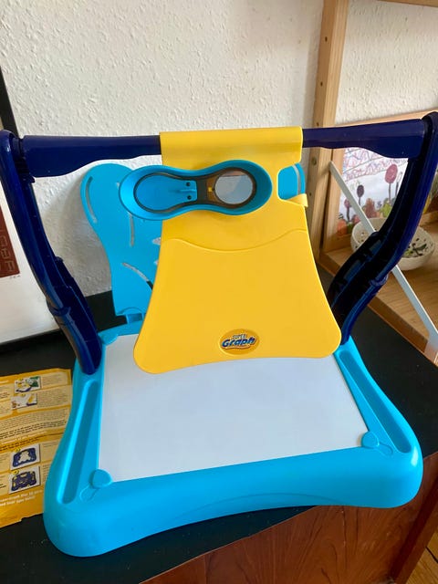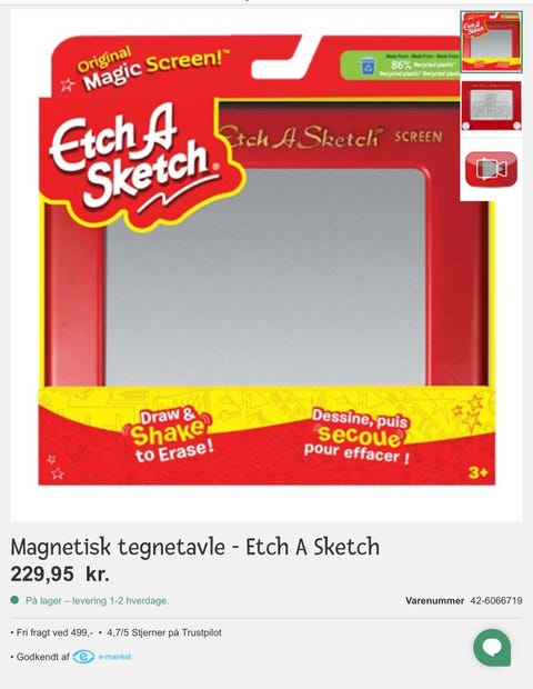Egentlig er det bare en tyk, grå skærm i en rød plastikramme, som har en hvid knap i de to nederste hjørner. Magien opstår først, når du drejer på knapperne, for de giver dig mulighed for at folde din indre kunstner ud. Knapperne er din pensel, og laver du et forkert strøg, eller vil du kreere et nyt værk, ryster du bare tavlen og hokus pokus: lærredet er blankt igen.