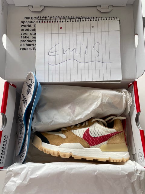 De kostbare sko er fra Nike, og de er ganske særlige, fordi der kun er produceret 12 styks af dem, og så er de håndsyet. Det par, som erhvervsmanden købte, var det eneste af de 12 par, der aldrig har været gået med. I hvert fald hvad man ved af.