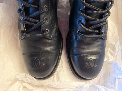 Støvlerne her er som nye, de er i ægte læder fra mærket Chanel, og de er kun brugt to gange, skriver Tina fra Ålborg. Der er de klassiske CC-logoer på siden og alt medfølger, skriver Tina. Både æske, dustbag og kvittering. De passer en størrelse 37,5. De lukkes med lynlås og kan stadig købes i butikkerne.