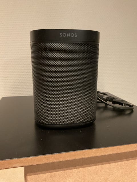 Her er en velholdt Sonos Play 1 højttaler. Selvom der er kommet nyere udgaver på markedet, lyder Play 1 fortsat rigtigt godt
