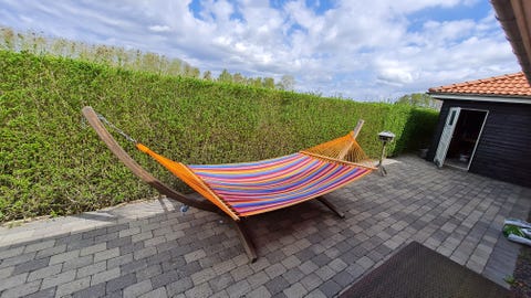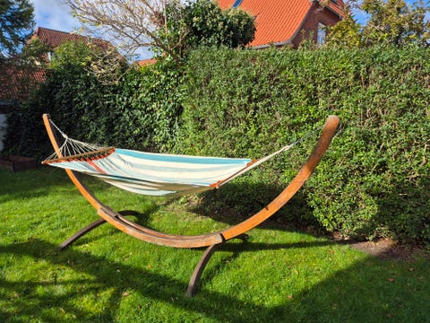 Og da jeg er så uendeligt heldig, at have to gamle æbletræer i haven med den perfekte afstand imellem, har jeg fået mig en hængekøje.