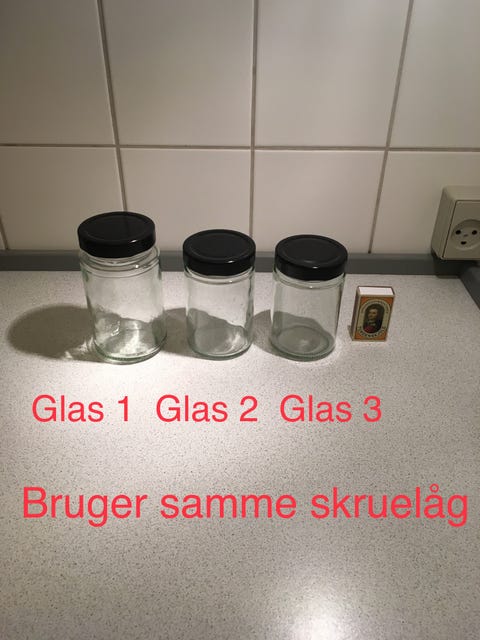 - Gamle glaskrukker med låg. Det gør ikke spor, hvis det er forskellige glas. Eksempelvis glas med patent låg eller sylteglas.