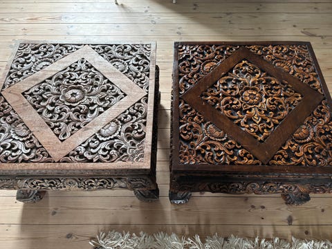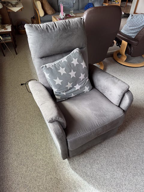 Gitte har nu sat stolen til salg på DBA, fordi den ikke længere passer ind i indretningen. Og det kan man ikke fortænke hende i, for stolen ser ganske speciel ud, og det kræver derfor de helt rigtige ting og den rigtige plads, hvis stolen skal passe bare nogenlunde ind.