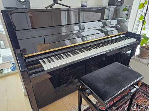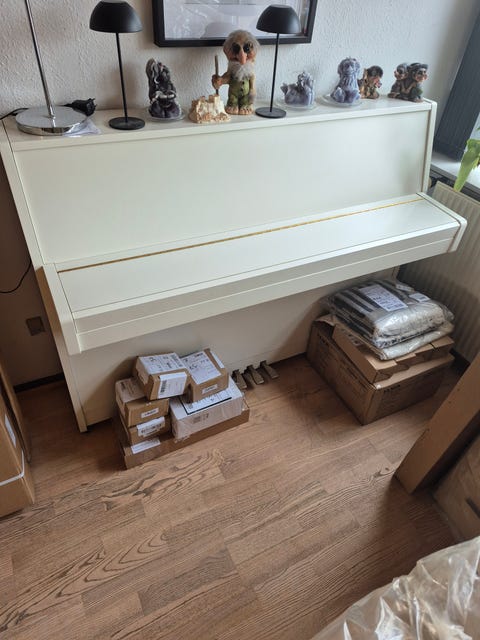 Typisk for vores hjem er også et element af multifunktionalitet. Vores flygel, der har tilhørt min mormor, kan ikke bare spille, men også lyse med selvklæbende lysdioder i låget. På sigt skal dets yderside også have en gang tavlelak, så vi kan skrive på det med kridt.