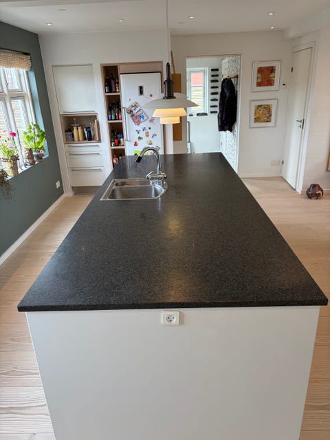 Vores køkken med sine spraglede fliser, malet af husets tidligere ejer, er blot et eksempel. De fleste ville nok have valgt at sætte et nyt køkken op, men vi synes, at det giver huset sjæl og hverdagen kulør med de anderledes kakler - og så vil vi faktisk også hellere bruge penge på den mad, vi kommer i køkkenet end på nye [køkkenlåger](https://www.dba.dk/have-og-byg/byggematerialer/koekkenelementer/produkt-laager/?vis=galleri &utm%5Fsource=DBAguide&utm%5Fmedium=contentlink&utm%5Fcampaign=GenbrugselskerMarieLouise).