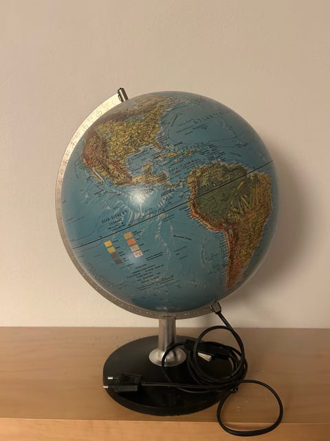 - Jeg søger tit efter gratis ting på DBA. Det har jeg fundet mange af husets møbler ved. For eksempel min globuslampe ovre i hjørnet, fortæller Nathalie og går hen til reolen.