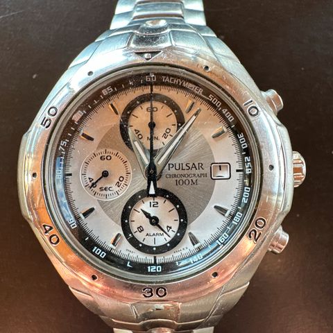 Meget sjældent Pulsar kronograf fra 90'erne. Multifunktions ur med avanceret tidstagning. Læs mere her: https://vintagewatchplace.com/new-old-stock-ultra-rare-pulsar-racing-chronograph-dancing-hands-left-pushers-nos/