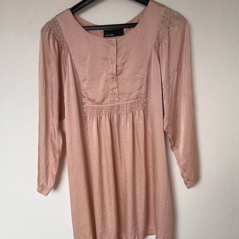Rigtig fin sandfarvet silkeskjorte fra Vero Moda i str. medium, rund halsudskæring og 3/4 ærmer, der er et lille rynk ved ærmerne, brugt få gange og er pæn og velholdt.