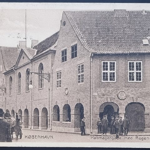 Coloreret postkort med Rundetårn og folk på gaden i København. Stemplet i Præstø 12.5.1908.
