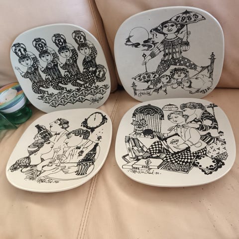 Flere forskellige ting. Store tallerkener, platter og vaser. Sort med undtagelse af 1 platte som er rød. SPØRG FOR ANTAL OG PRIS.