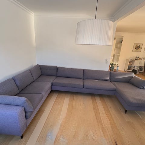 Flot blå Bolia hjørnesofa med chaiselong fra røgfrit hjem. Her både sidder og ligger du godt.