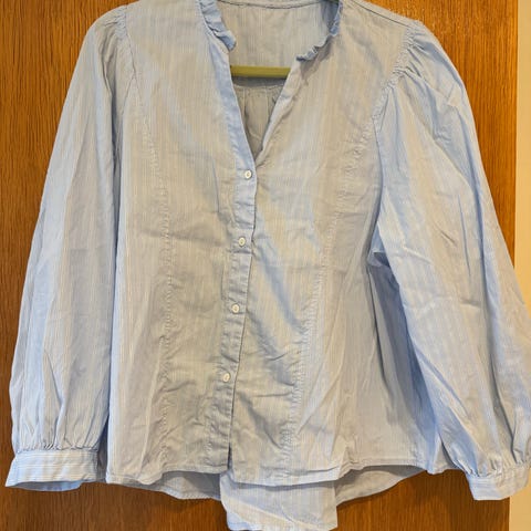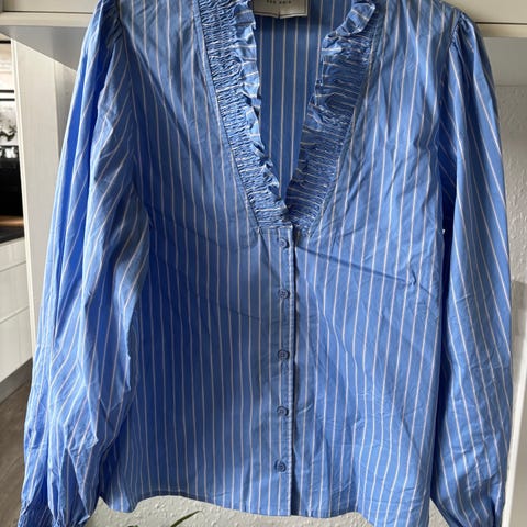 Fin krølfri bluse med grafisk print i blå. Gennemknappet, med v-udskæring og korte ærmer afsluttet med smock.