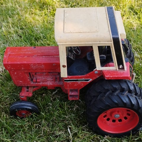 Vintage Case traktor med vogn. Fin stand, men med skrammer. Udstødningsrøret (lodret foran) er knækket af.