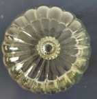 2. Lille uden riller. Højde 13 cm. diameter 15,5 cm. De. Har er lille afslag og lidt skrab i glasset( se billeder) pris 50,-