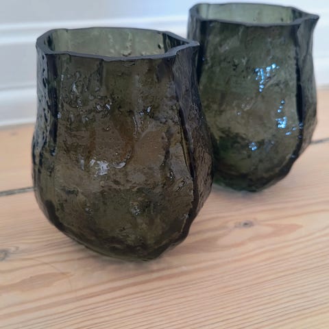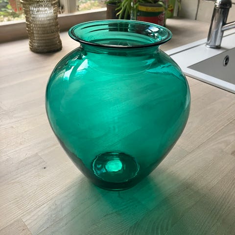 Meget smuk grøn glasvase i en fin form. 19 cm. høj .Flot enkeltstående, men også til en enkelt gren eller blomst.