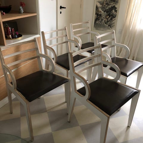 2 stk brugte spisebordsstole som er flot design, men dårlig lavet, hvis Johannes Andersen, Kai Kristiansen, Farstrup og Kjærnulf havde fået et handicappet barn sammen, så vil det nok se ud som disse stole 🙂 der er mærker, afslag i finer, dårlige samlinger, og løst sæde. Super charmerende stole. B:50cm. D:42cm. H:73cm. SH:43cm. Stole er ikke nye og sælges derfor som brugte, derfor kan der forekomme ridser, slid og skrammer. Prisen er kun 750kr.
