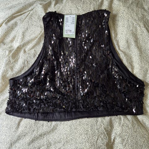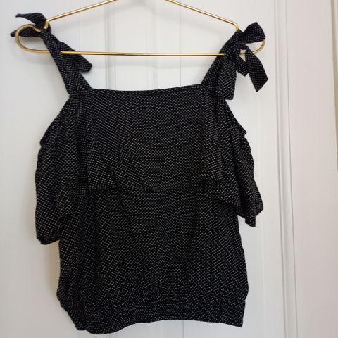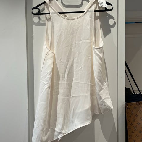 Top med høj hals uden arme, lynlås bagpå. Blå/ lyseblå med guld kant. Blod og behagelig stof. Halv pris tilbud.