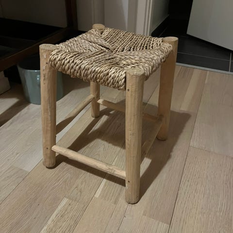 En sød taburet med 3 ben og overflade i koskind.den er fra tanzania.40 cm høj.diameter 30 cm.