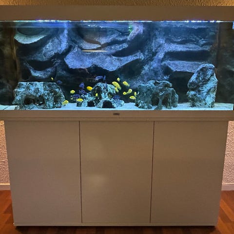 Sælger et fantastisk 720 liters. Det er med buet frontglas og med en fantastisk baggrunds filter. Der medfølger møbel, fisk, sand,trærøder. Fiskene er en blanding mellem mange slags chiclider., som heros og Malawi. mm