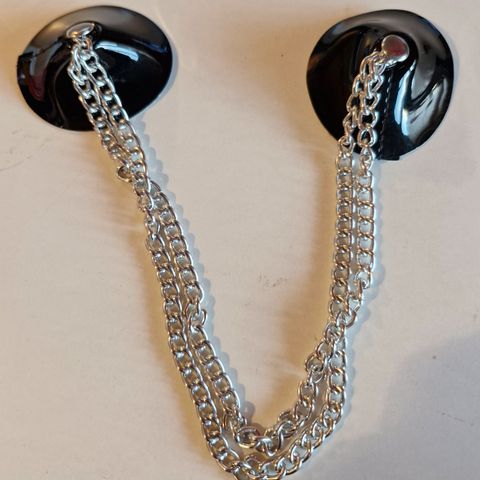 Blomst eller pompon I sort chiffon, der enten kan monteres som en broche med sikkerhedsnålen eller med clipsen I en hårelastik, på kanten af lommen eller i udskæringen til lige at dække kavalergangen.